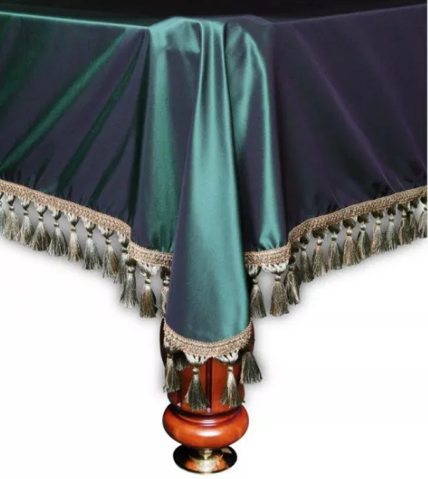 Данное покрывало предназначено для бильярдного стола размером 12 футов, сделано оно из такой ткани, как шелк, у него тёмный зелёный цвет. Данный цвет подойдет к любой бильярдной комнате, особенно выполненной в классических тонах. По краю покрывала расположены кисточки, которые его украшают. Такое покрывало не даст влаге и пыли испортить бильярдный стол, с ним стол всегда будет в идеальном состоянии, даже во время простоя.