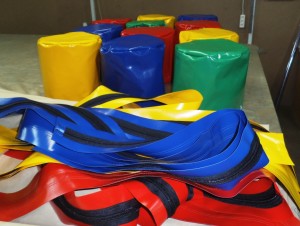 Чехлы на инвентарь детской площадки пошиты из тентовой технической ткани ПВХ ярких цветов и поролоновой мягкой прокладки для того, чтобы могли свободно играть и не травмироваться. Ткань ПВХ имеет все допуски по санитарно-техническим нормам, прочна и долговечна, прекрасно подходит под изготовление и пошив спортивно-детского инвентаря и чехлов для него: мягкие маты, детские площадки, игрушки и т. п.