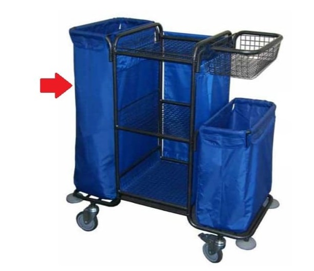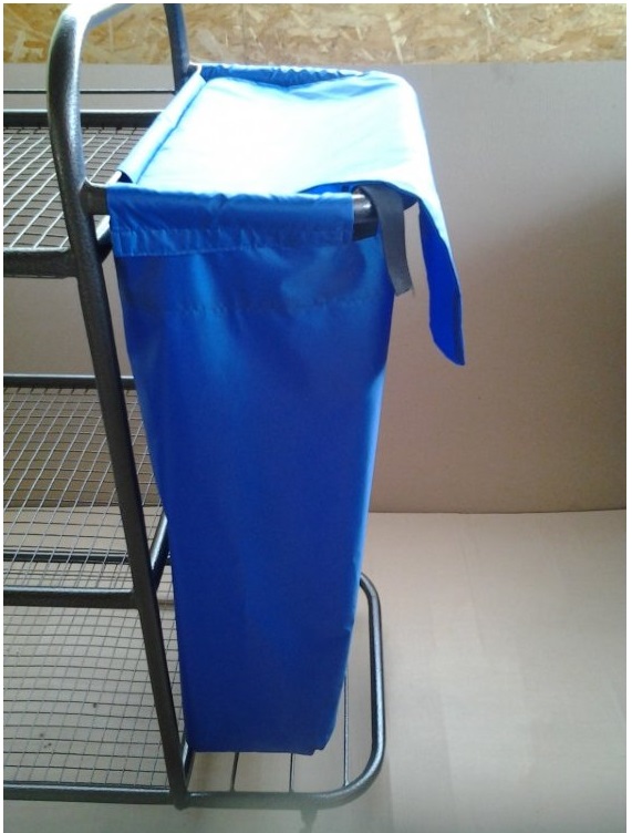Мешок из высокопрочного нейлона на 110 л из водонепроницаемой ткани. С открытой стороны- крышка в виде клапана. Мешок крепится к тележке с помощью липучек.
