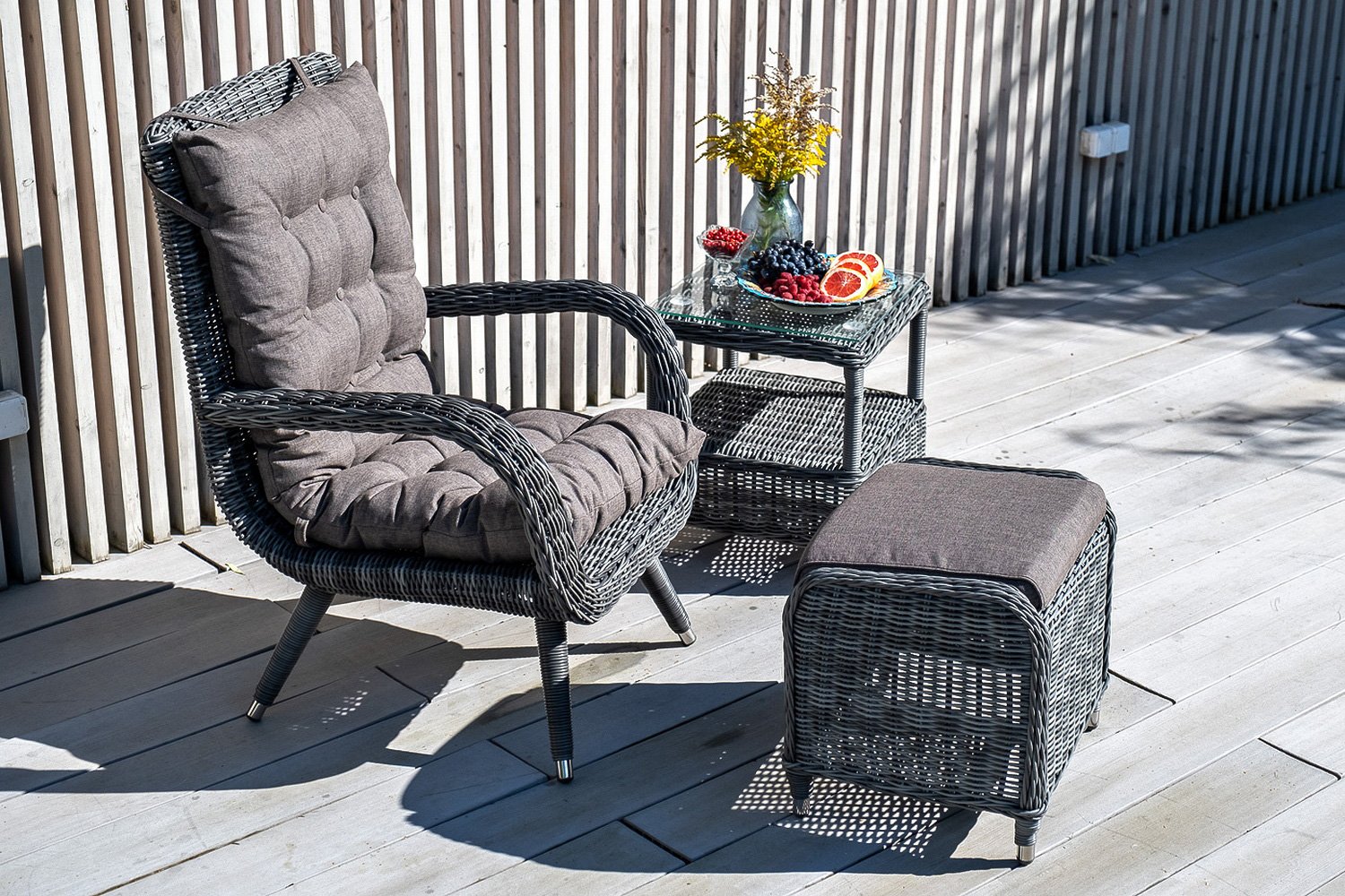 Кресло изготовлено на основе алюминиевого каркаса, который обтянут искусственным ротангом цвета графита. Такая оплетка выглядит стильно и элегантно, а также очень прочна и не требует особого ухода. Спинка кресла имеет удобную высоту, а подлокотники придают ему еще больше комфорта. Габариты Toledo составляют 81х99х69 см, что делает его идеальным для любого интерьера – будь то квартира или беседка на даче.