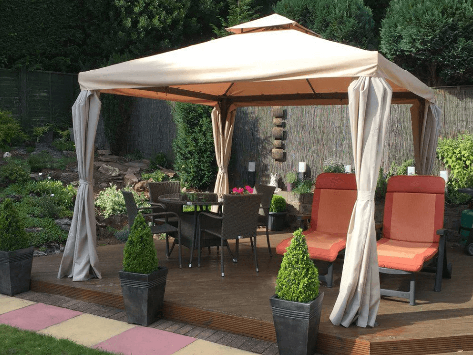 Прежде всего, материал должен быть непроницаемым для влаги, так как под тентом часто устраивают мероприятия с мебелью и столами. В случае даже незначительных протечек во время плохой погоды возникают серьезные проблемы.