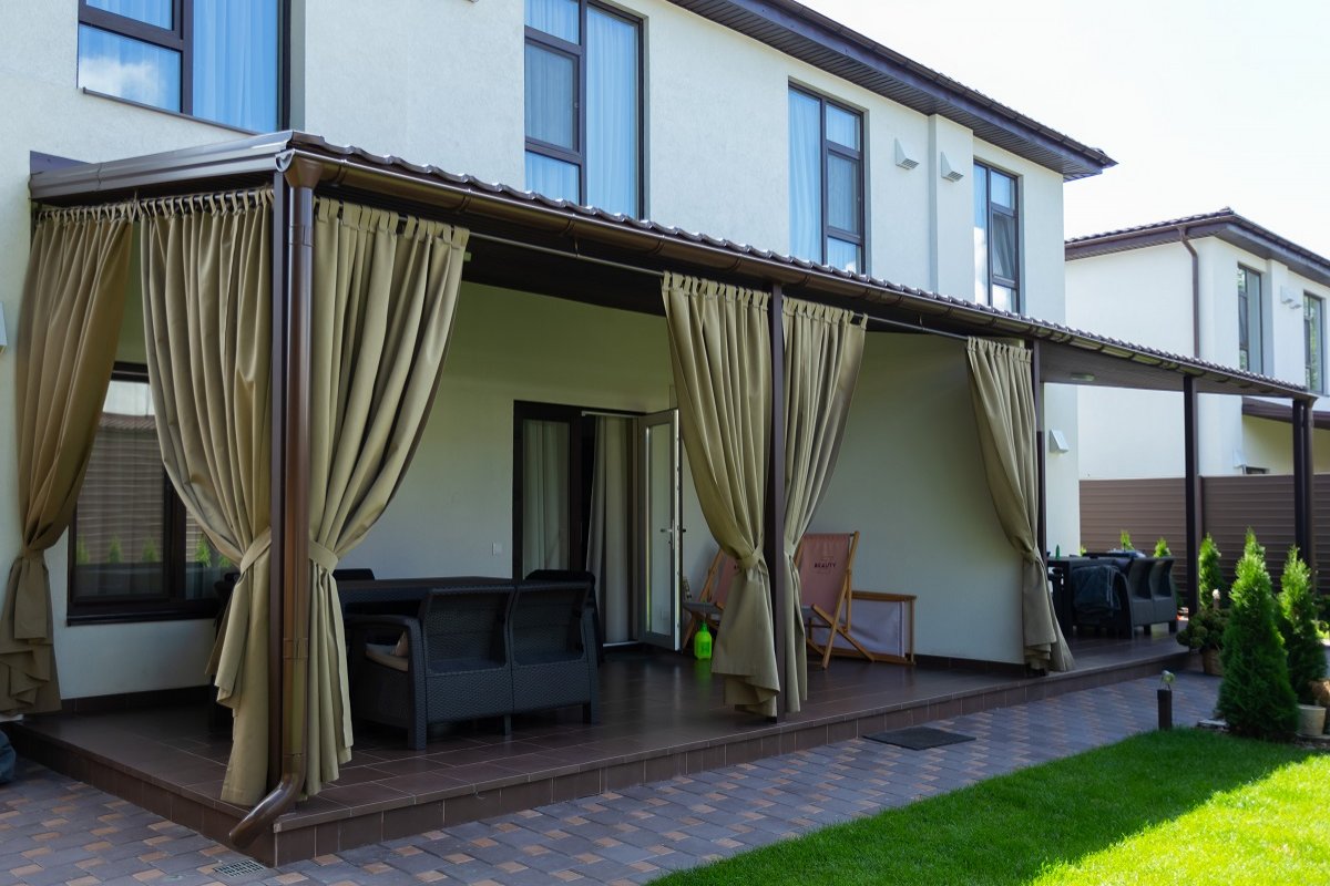 Для открытых веранд нужен особенный текстиль - практичный, долговечный, не требующий аккуратного использования. Естественно, на улице такие ткани дополнительно подвергаются сильной нагрузке - например, ветер легко может сорвать плохо закреплённую штору, дождь и грязь просто её запачкают, а гости могут повредить и задеть материал.