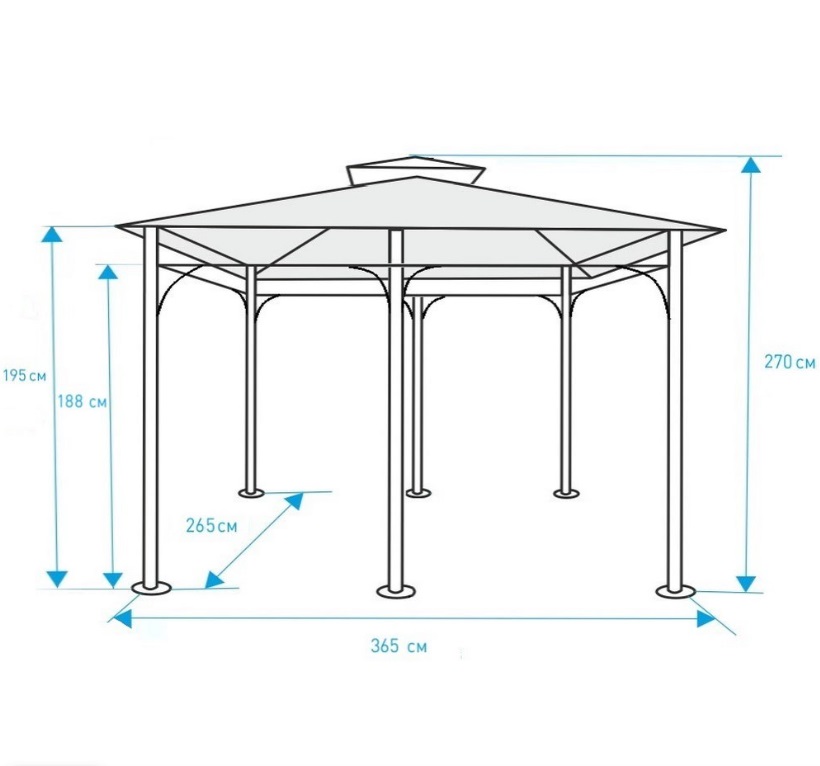 Габаритные Размеры: ширина - 265 см, длина - 365 см, высота - 271 см.